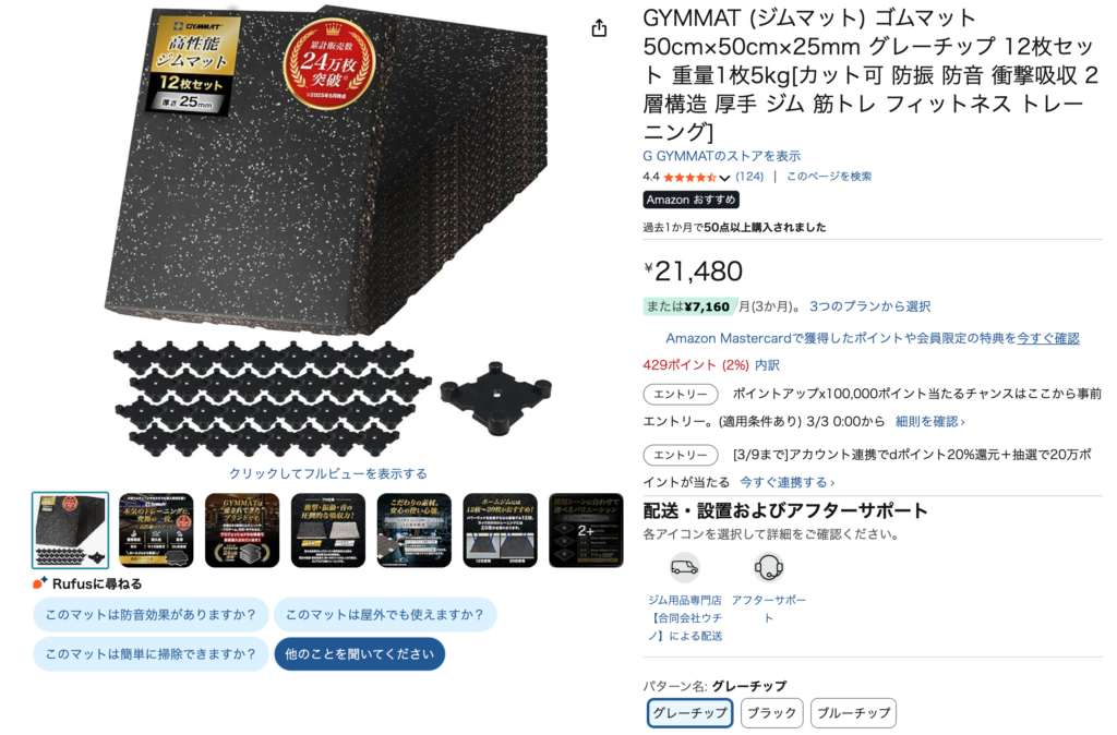 今回使用したのは「GYMMAT」さんの25mm厚ラバーマット(50cm×50cm)。