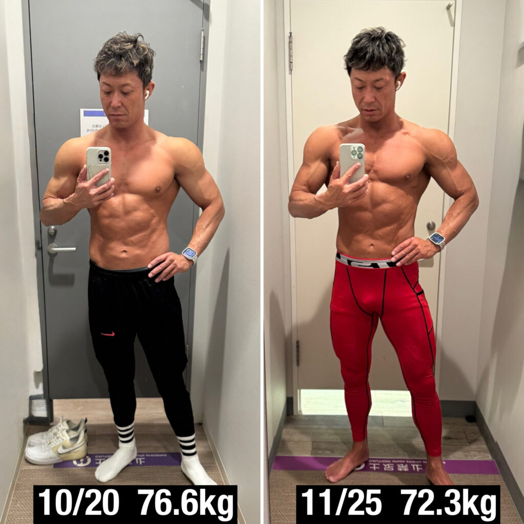 下の写真は、10月20日(76.6kg)から11月25日(72.3kg)までの比較です。